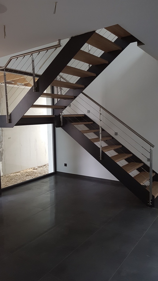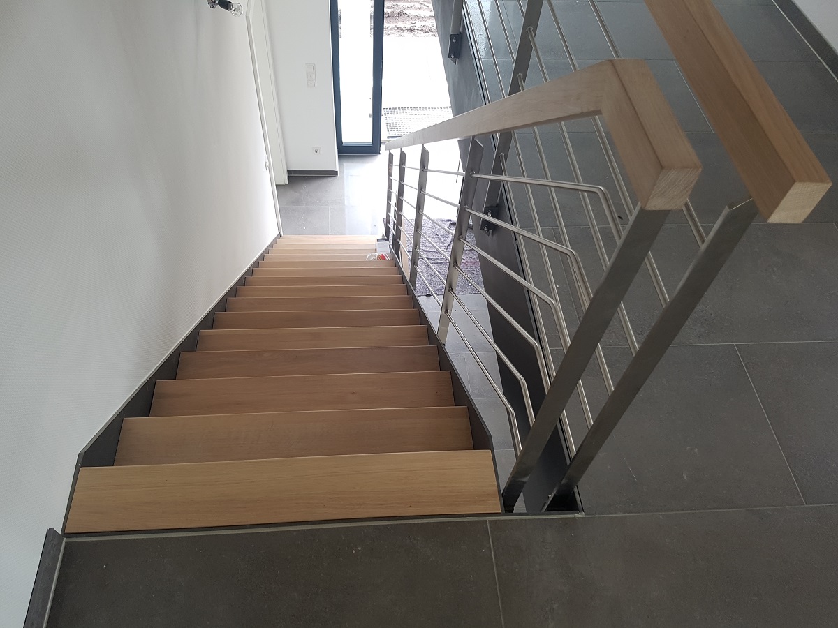 Eine gelaserte Stahlwange, kombiniert mit Holz und Edelstahl wird zum Zentrum